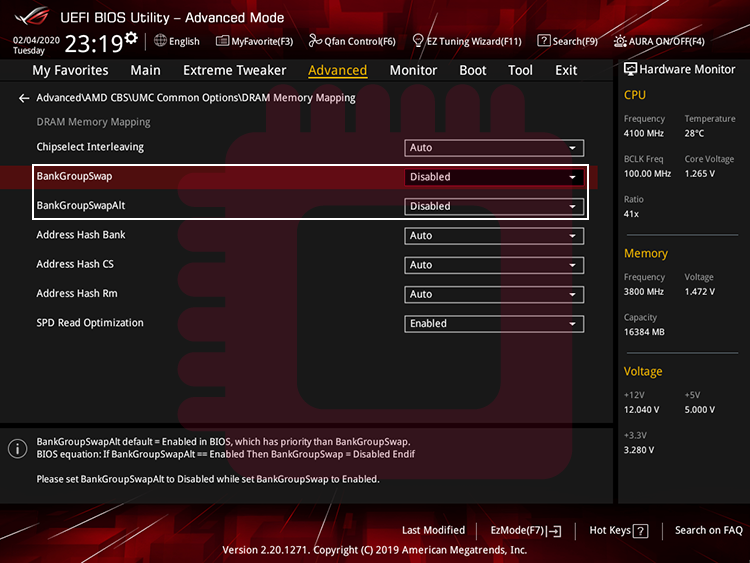 BGS… BGS is a function to assign applications to physical areas of memory modules. When this is turned on, it brings benefit at running synthetic test apps and disadvantage at running game apps (https://community.amd.com/community/gaming/blog/2017/07/14/memory-oc-showdown-frequency-vs-memory-timings). If you value practicality, I think it is better to turn BankGroupSwap and BankGroupSwapAlt off.