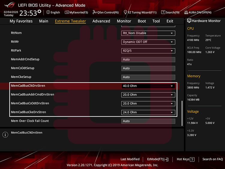 CAD_Bus (Command/Address/Data_Bus) Drive Strength… It means resistances which is applied to pins on a DRAM. Enter provisionally the values calculated by the DRAM Calculator. The optimal values of CAD_Bus Drive Strength depend on the circumstance composed by your PC parts, so you should adjust that later.