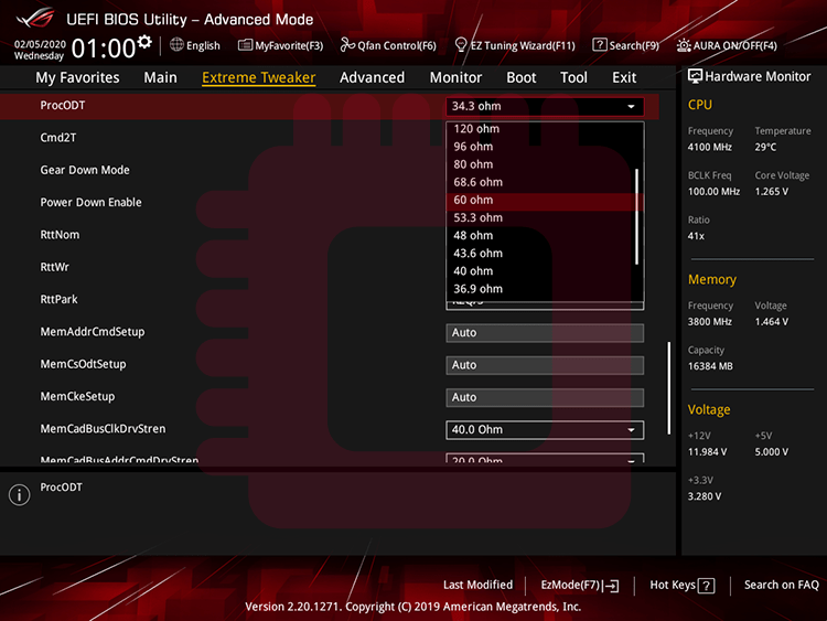 ProcODT (Processor On-Die Termination)… It means termination resistance. We will test each values one by one, and safe line for daily-use is under 60 Ohm.