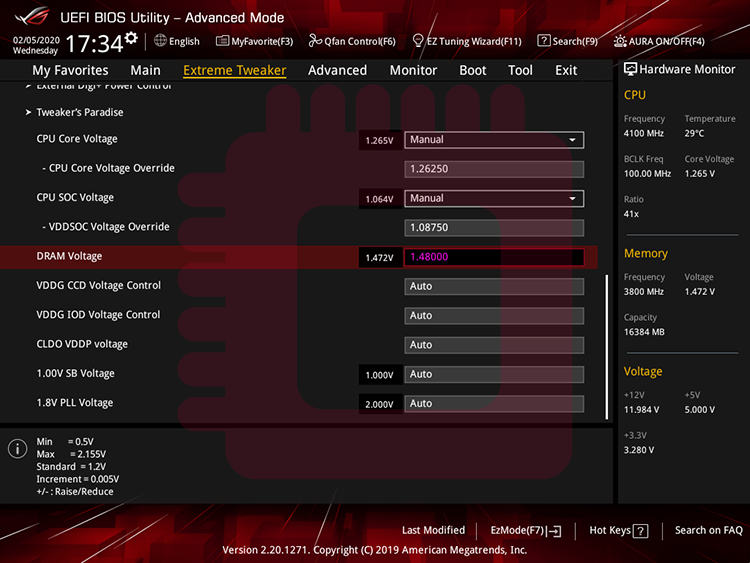 エラーが生じない場合,DRAM電圧を一時的に下げてエラーを発生させ,最適値を見つけます.最適値が見つかり次第,DRAM電圧を元に戻してください.