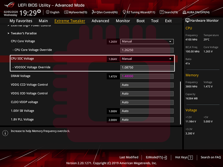 CPU SoC電圧… これはCPUのメモリコントローラーに適用されます.常用では1.1 Vかそれよりわずかに高い値を上限とします.