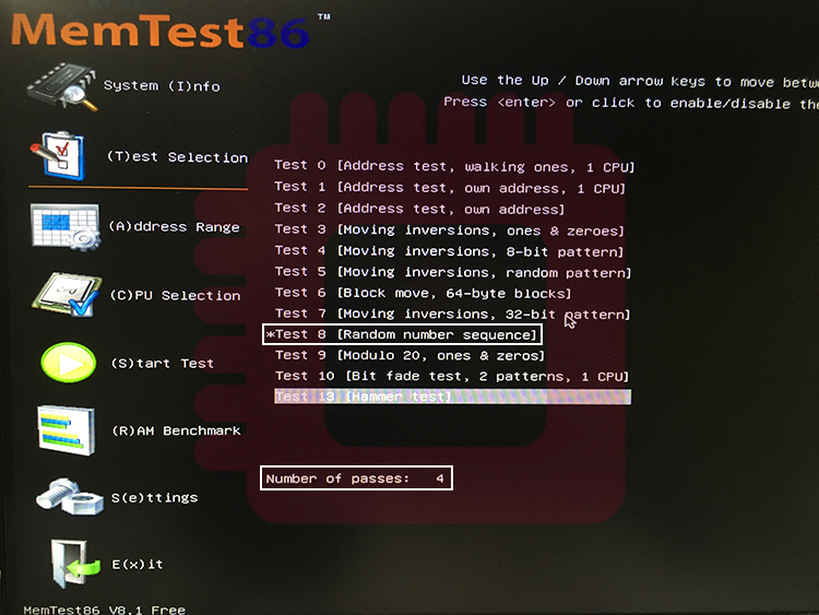 Boot memtest86 and execute only test8, ‘Random Number Sequence,’ for 4 times.