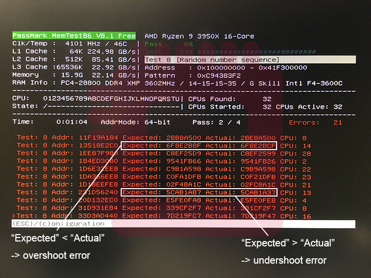 再度memtest86のtest8を実行し,生じたエラーの結果(「Expected」,「 Actual」)を可能な限りメモします.そして,「Expected」と「Actual」の数値を比較し,「Actual」が「Expected」より高い結果の数と低い結果の数を記録します.「Actual」が「Expected」より高い結果が多い(オーバーシュートエラーが多い)場合は今のCAD_Bus Drive Strengthが理想値より低く,「Actual」が「Expected」より低い結果が多い(アンダーシュートエラーが多い)場合は今のCAD_Bus Drive Strengthが理想値より高いことを示しています.